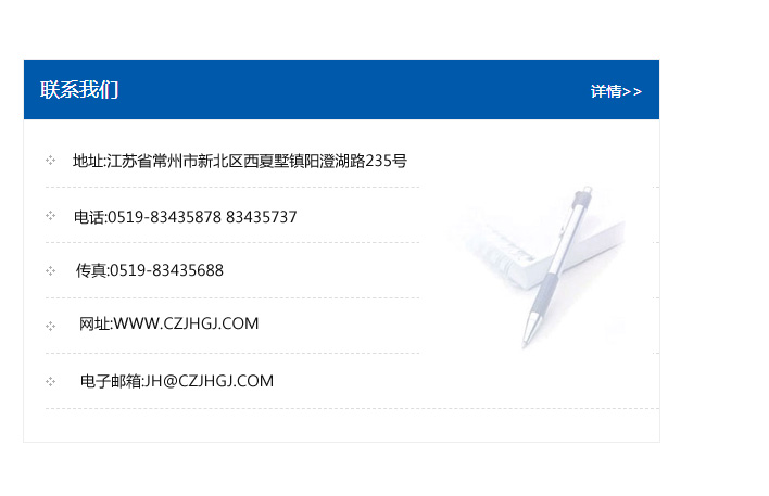 傳真:0519-83435688    郵編:213135    網址:WWW.czjhgj_com.yespull.com    電子郵箱:JH@czjhgj_com.yespull.com